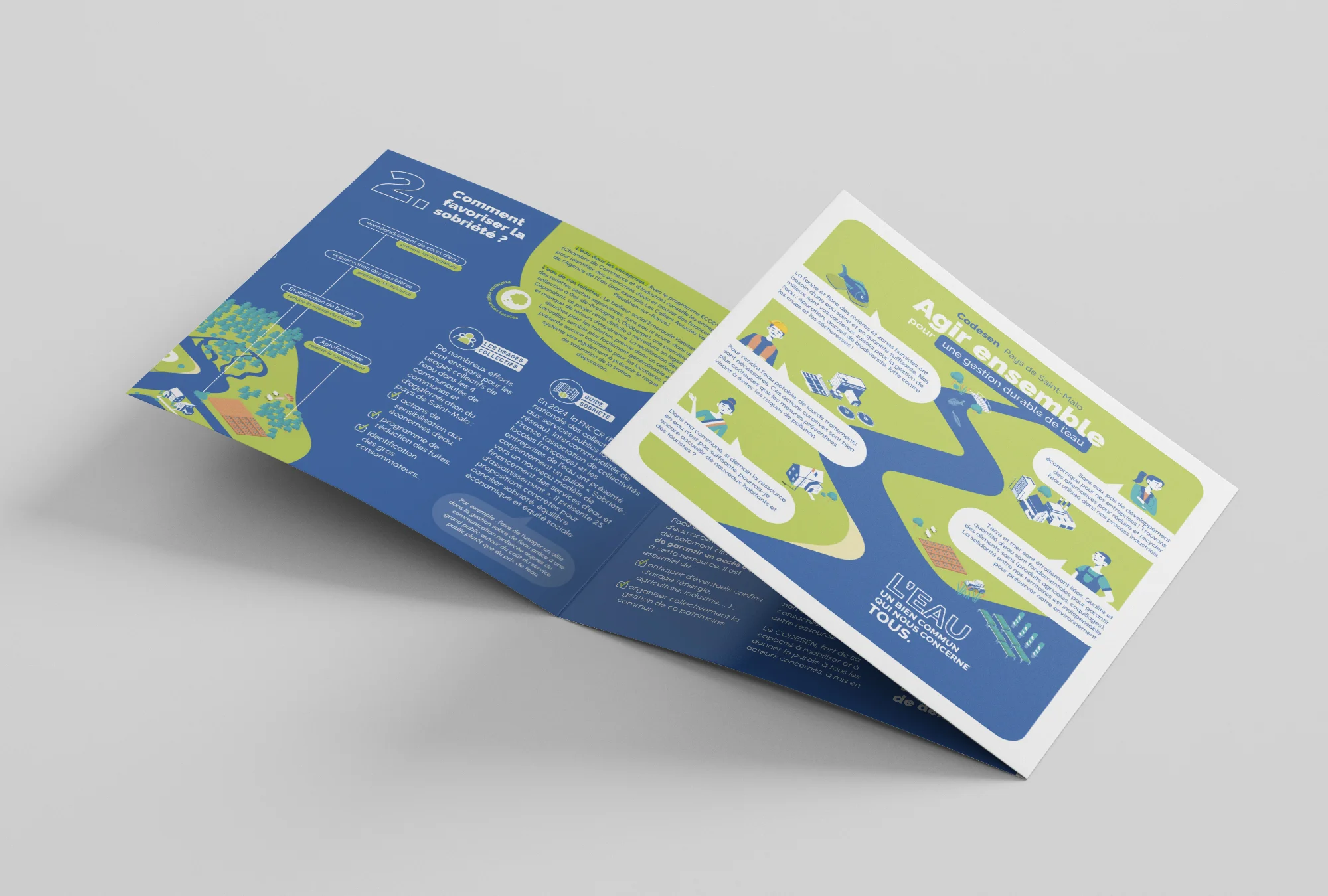 Pour ce projet, le Codesen nous a contacté pour mettre en lumière et vulgariser sous forme de dépliant le sujet de la gestion durable de l’eau. L’objectif était de créer un support de communication accessible pour le grand public, et présentable aux lélus.
